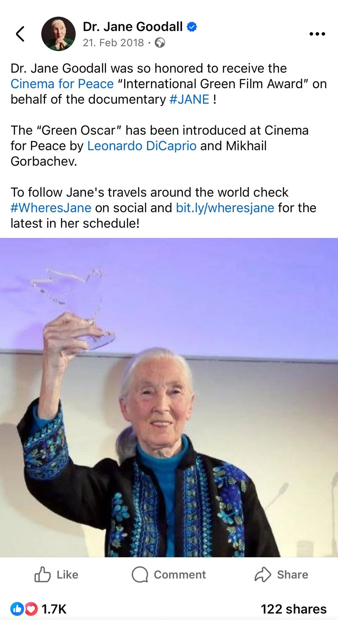 Two films stand as profound milestones. „Jane's Journey“ (2009), directed by David Hess and David Johnson, follows the septuagenarian Goodall on a whirlwind tour, blending archival gems with her urgent pleas against chimp exploitation. Premiering at Tribeca, it clinched the Cinema for Peace International Green Film Award, celebrating film's power to drive environmental advocacy. Then came „Jane“ (2017), Brett Morgen's Oscar-nominated masterpiece, unearthed from over 100 hours of van Lawick's unseen 16mm footage in National Geographic's vaults. Interwoven with Philip Glass's evocative score and Goodall's own narration, it captures her youthful awe amid Gombe's trials, the tool-use epiphanies, the chimp raids on camp, the birth of her son Grub while confronting the era's darker undercurrents, like colonial shadows. In 2018 the film was awarded the Cinema for Peace International Green Film Award again, which Goodall received in Berlin personally, starting her speech on stage with chimpanzee cries!